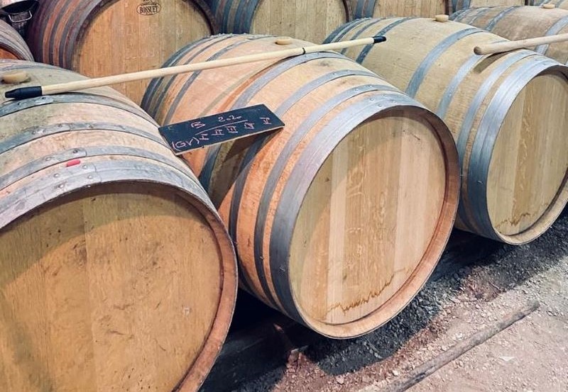 Une fois arrivées au chai, les baies de raisins rouges sont encuvées pour des phases de macération puis de fermentation alcoolique. Ensuite, à la fin de l’écoulage, le vin de goutte est assemblé pour faire sa deuxième fermentation, la fermentation malolactique. Cette première étape dure en moyenne 3 semaines. Ensuite, l’élevage a lieu en barriques pendant 15 mois durant lesquels les vins vont gagner en structure et maturité avant d’être commercialisés.